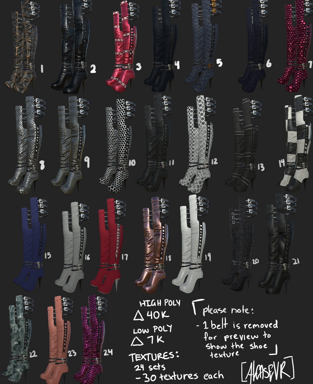 PLEASE NOTE: These do not come rigged. Everyones rig is different so weight painting may not work from one rig to another. You can follow my quick tutorial if needed for transfering weights over from your body to shoe: https://twitter.com/Alease_VR/status/1216469114996178949?s=20