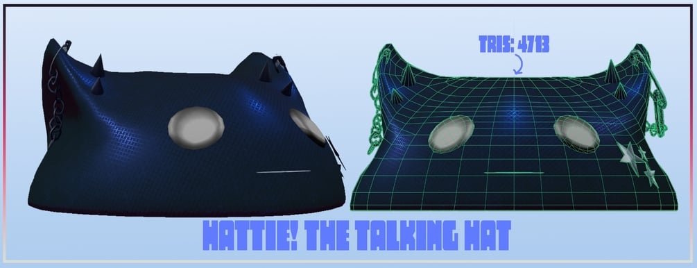 This hat can be linked to visemes, taken into blender to merge with current visemes to decrease shape key count as well. It is moderately lower poly. The poly count is caused from moving parts such as lips and eyes.